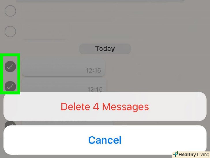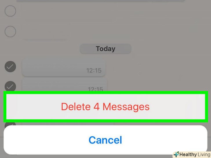 Натисніть < span class="nowrap" title="This is not a clickable button; it illustrates the button one should find." style="font-family: Segoe UI, Frutiger, Frutiger Linotype, Dejavu Sans, Helvetica Neue, Arial, sans-serif;letter-spacing:0px;padding:0em .6em; border:1px solid; border-color:#AAA #555 #555 #AAA; -moz-border-radius: 0px; -webkit-border-radius: 0px; border-radius: 0px; background-color: #F2F2F2; background-image: -moz-linear-gradient(top, #FCFCFC, #E0E0E0); background-image: -o-linear-gradient(top, #FCFCFC, #E0E0E0); background-image:-webkit-linear-gradient(top, #FCFCFC, #E0E0E0); background-image: linear-gradient (top, #FCFCFC, #E0E0E0); " > видалити повідомлення.ця опція розташована в нижній частині екрана. Так ви видалите вибране в історії розмови повідомлення.- Якщо ви видаляєте кілька повідомлень, то у вікні буде написано "видалити [кількість] повідомлень".
