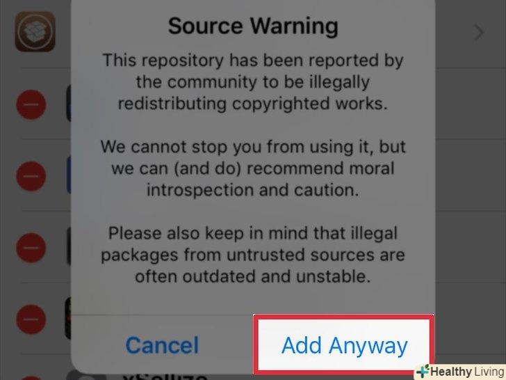 Торкніться " Add Anyway "(все одно додати) у спливаючому вікні.Cydia додасть репозиторій з AppSync до свого списку репозиторіїв.