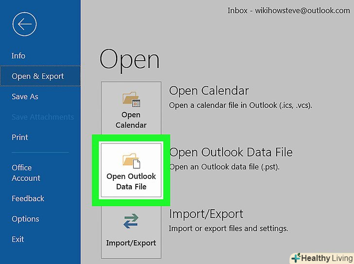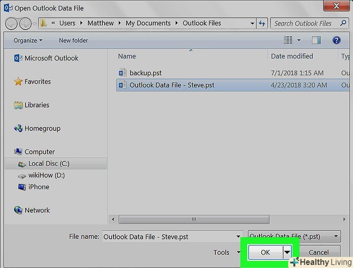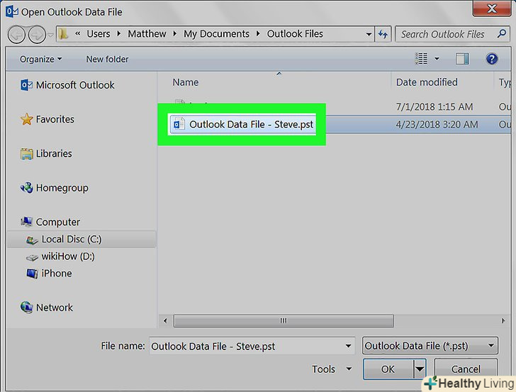Виберіть архівний файл Outlook. Форматом таких файлів є PST. За замовчуванням такі файли зберігаються в C:\Пользователи\Имя_пользователя\Документы\Outlook Files, де замість "Імя_користувача" підставте ім'я свого облікового запису Windows.[2]