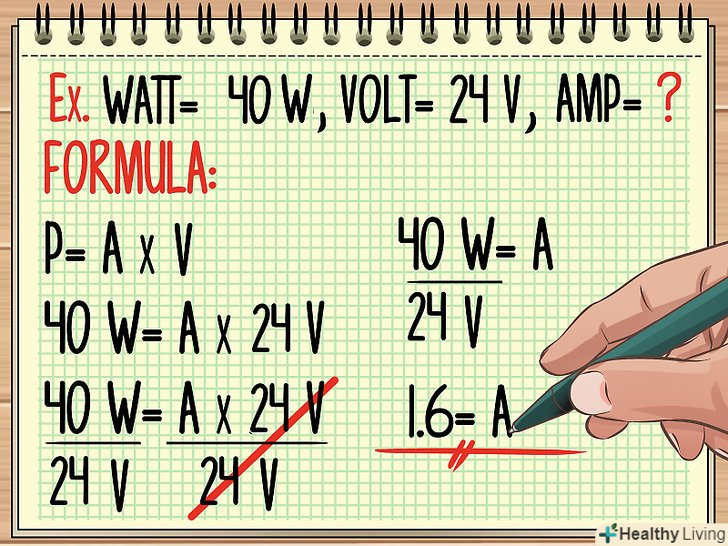 Обчисліть силу струму або напругу за аналогічною формулою. для цього відповідні величини потрібно ділити, а не множити. Наприклад, напруга джерела живлення дорівнює 24 В, а його потужність дорівнює 40 Вт. [4]- Сила струму джерела живлення дорівнює 1,6 а.Так як Р = i x V, то I = Р/V = 40/24 = 1,6. [5]