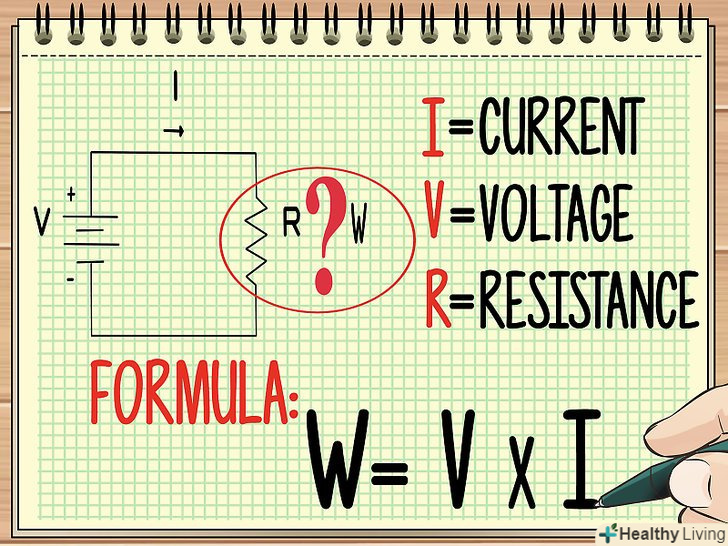 Обчисліть потужність резистора. для цього вам знадобляться значення сили струму (I) і напруги (V) Джерела живлення. Залежність величин описує закон Ома. [6]- Формула для обчислення потужності: Р = V x I. [7] іноді потужність позначають буквою W, а не Р.