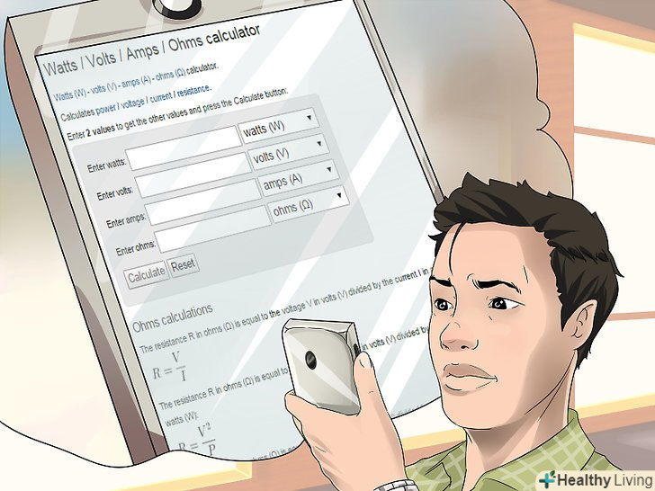 Знайдіть онлайн-калькулятор. в Інтернеті є безліч онлайн-калькуляторів, призначених для обчислення потужності. Такі калькулятори роблять розрахунки в автоматичному режимі, тобто формули вводити не потрібно. [8]- В калькулятор потрібно ввести тільки два значення-силу струму і напругу. Потім натисніть кнопку "порахувати", і ви отримаєте значення потужності.