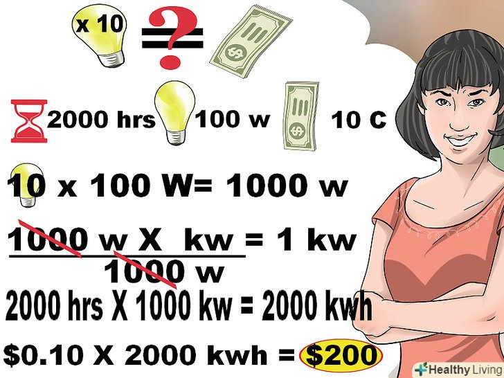 - Наприклад, у вашому будинку 10 лампочок. Кожна лампочка споживає 100 Вт. 10 х 100 = 1000 Вт. 1000 Вт розділіть на 1000 і отримаєте 1 кВт. Наприклад, лампочки горіли протягом 2000 годин (на рік). Таким чином, 1 кВт х 2000 ч = 2000 кВт. Припустимо, один кіловат-годину коштує 5 руб. 2000 кВт-год х 5 = 50000 руб. Таким чином, за користування десятьма лампочками протягом року ви заплатите 50000 руб.