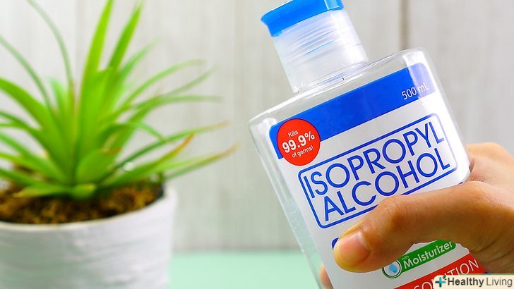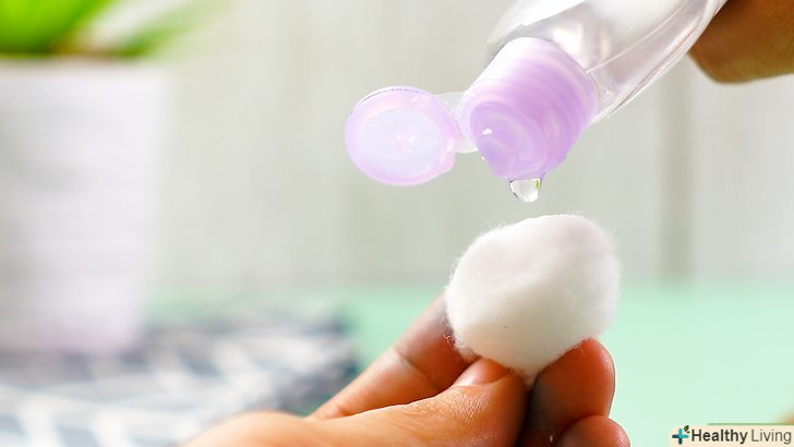 - Змочіть ватний тампон в спирті. якщо ділянка забруднення досить великий, використовуйте складений паперовий або махровий рушник. Якщо ви використовуєте дезінфікуючий засіб для рук, можна пропустити цей крок і нанести цей засіб безпосередньо на шкіру.