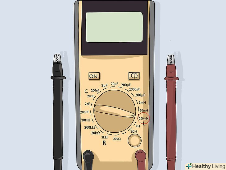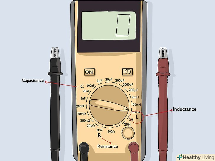 Виставте на RLC-метрі "L", тобто функцію вимірювання індуктивності. за допомогою RLC-метра можна вимірювати різні величини, які вказані навколо поворотного перемикача. "L" означає необхідну Вам індуктивність. Якщо у вас портативний RLC-метр, поверніть перемикач так, щоб він вказував на «L». Якщо ви використовуєте електронний прилад, виставте на дисплеї " L " за допомогою кнопок. [9]- RLC-метри мають різні опції-переконайтеся, що ви вибрали ту, що потрібна вам. "С «відповідає вимірюванню ємності, а» R" — опору.