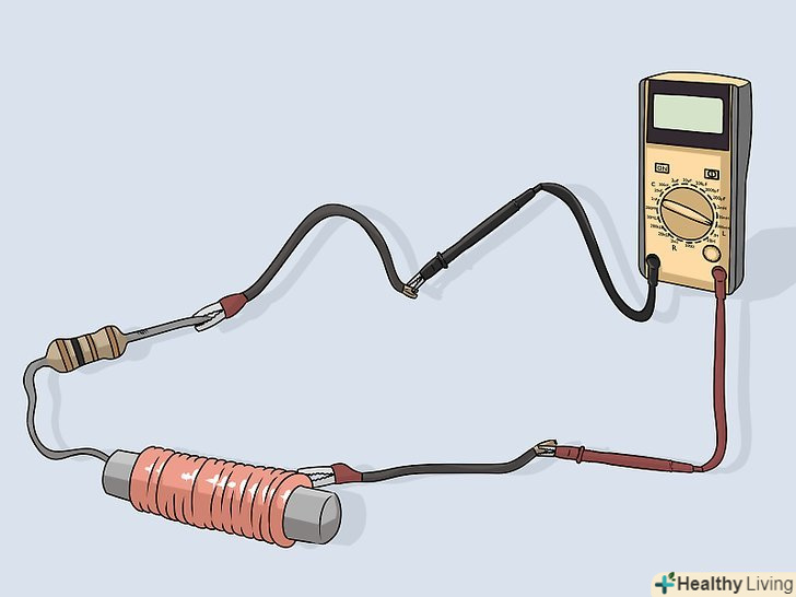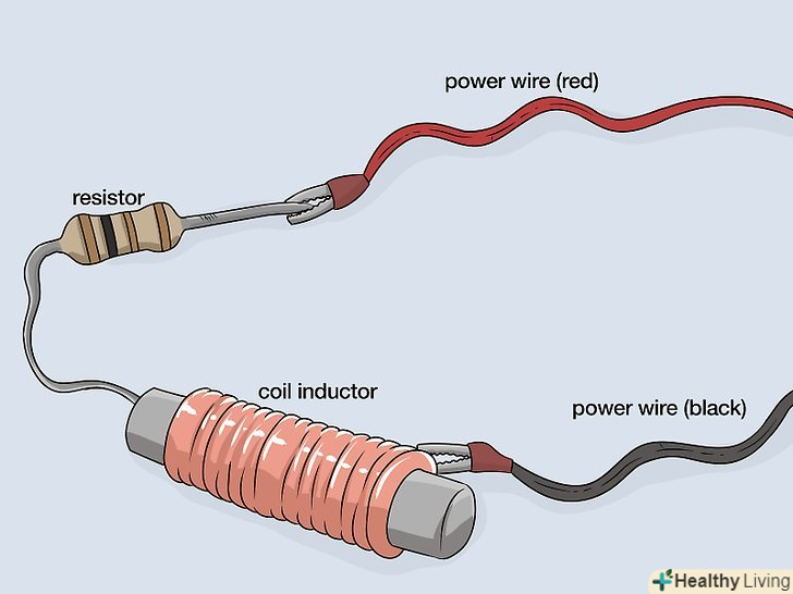 Підключіть котушку індуктивності до резистора послідовно. послідовне з'єднання означає, що струм буде послідовно проходити через окремі частини ланцюга. Для початку розмістіть котушку і резистор поруч так, щоб вони торкалися один одного одним контактом. Замкніть ланцюг: для цього підключіть до вільних контактів резистора і котушки індуктивності дроти живлення. [2]- Дроти можна придбати в магазині електротоварів або замовити через Інтернет. Зазвичай вони мають червоний і чорний колір, щоб їх легко було розрізнити. Підключіть червоний дріт до вільного кінця резистора, а Чорний - до протилежного вільному контакту котушки.