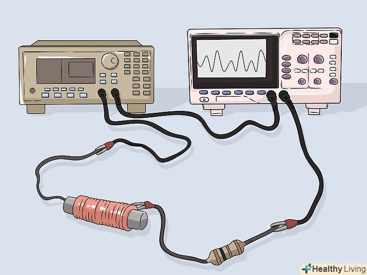 Підключіть до ланцюга функціональний генератор і осцилограф. Підключіть вихідні контакти функціонального генератора до осцилографа. Потім увімкніть обидва прилади і переконайтеся, що вони працюють. Після цього підключіть червоний вихід функціонального генератора до червоного проводу ланцюга. Чорний вихід осцилографа підключіть до чорного проводу ланцюга. [3]- Функціональний генератор являє собою тестовий прилад, який подає в ланцюг електричні хвилі. Він дозволяє контролювати проходження сигналу через ланцюг, і з його допомогою ви зможете точно виміряти індуктивність.