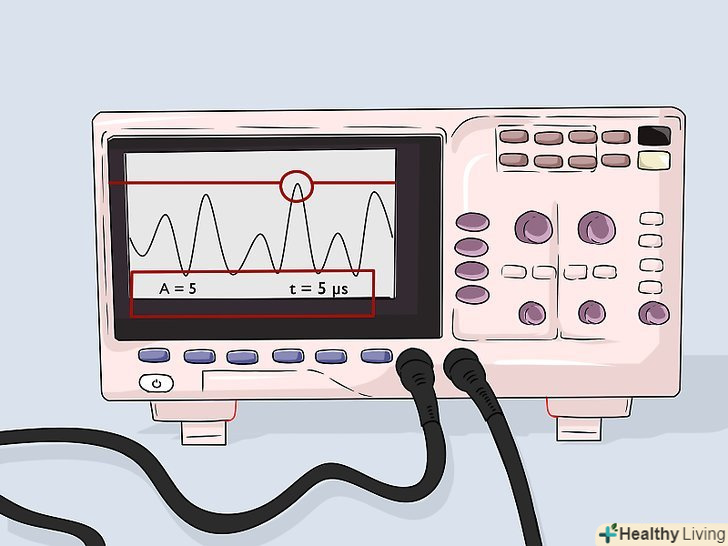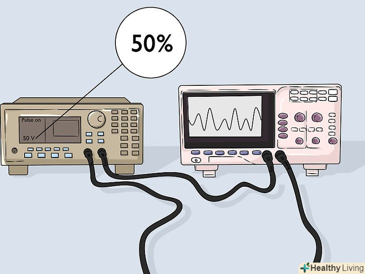 Виставте тривалість імпульсів 50% або менше. Подивіться на зображення імпульсу на екрані осцилографа. Верхні точки відповідають активній фазі сигналу. Вони повинні відхилятися від нуля приблизно настільки ж, що і нижні точки. Період імпульсу відповідає довжині однієї повної хвилі на дисплеї осцилографа. [14]- Наприклад, активна фаза імпульсу може тривати одну секунду, потім сигнал відсутній протягом ще однієї секунди. В результаті на дисплеї осцилографа вийдуть симетричні хвилі, оскільки імпульс буде активний тільки половину часу.