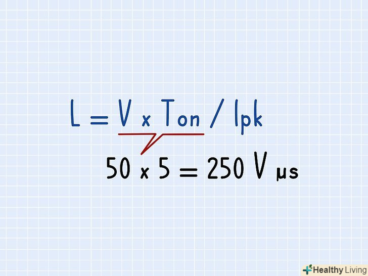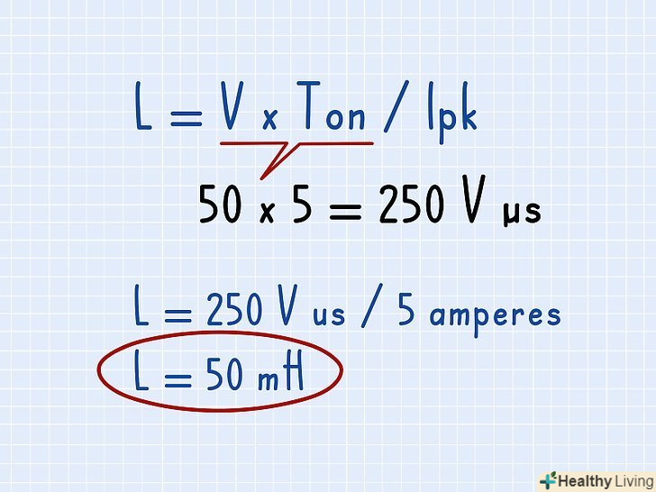 Перемножте напругу і тривалість імпульсів. використовуйте для знаходження індуктивності формулу L = V*Ton/Ipk, де V — імпульсна напруга, Ton — інтервал часу між імпульсами, Ipk — імпульсний струм, який ви виміряли раніше. Всі вхідні в дану формулу величини повинні відображатися на осцилографі. [16]- Наприклад, якщо імпульс 50 вольт подається раз в 5 мікросекунд, маємо 50 x 5 = 250 вольт-мікросекунда.