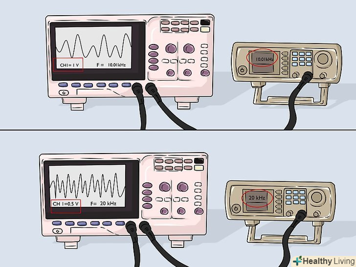 Слідкуйте за вхідною напругою і напругою на резисторі на дисплеї. на екрані осцилографа ви побачите пару синусоїдальних хвиль. Одну з них можна контролювати за допомогою функціонального генератора. Друга, більш низька синусоїда, відповідає місцю з'єднання котушки і резистора. Відрегулюйте частоту функціонального генератора так, щоб спостерігається на екрані напруга в місці з'єднання становила половину початкової вхідної напруги. [5]- Наприклад, виставте на генераторі таку частоту, щоб напруга між піками обох хвиль на дисплеї осцилографа становило 1 вольт. Потім змініть її, поки напруга не стане 0,5 вольта.
