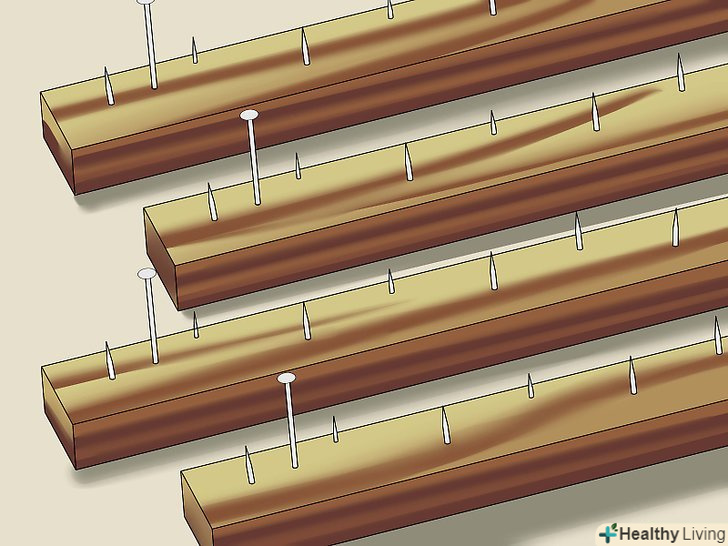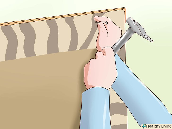 Прибийте килим до рейки. покладіть край килима на верхню рейку і з силою притисніть його. Спеціальними цвяхами прибийте краю килима, а потім третім цвяхом зафіксуйте середину. Вбийте цвях в килим і рейку. Вбийте цвяхи в усі краї, починаючи з кутів, а нижню планку прибийте в останню чергу.- Спеціальні цвяхи для килимових покриттів функціональні і красиві. Вони дозволяють надійно прикріпити килим до рейки і нерідко мають дуже цікаве оформлення.