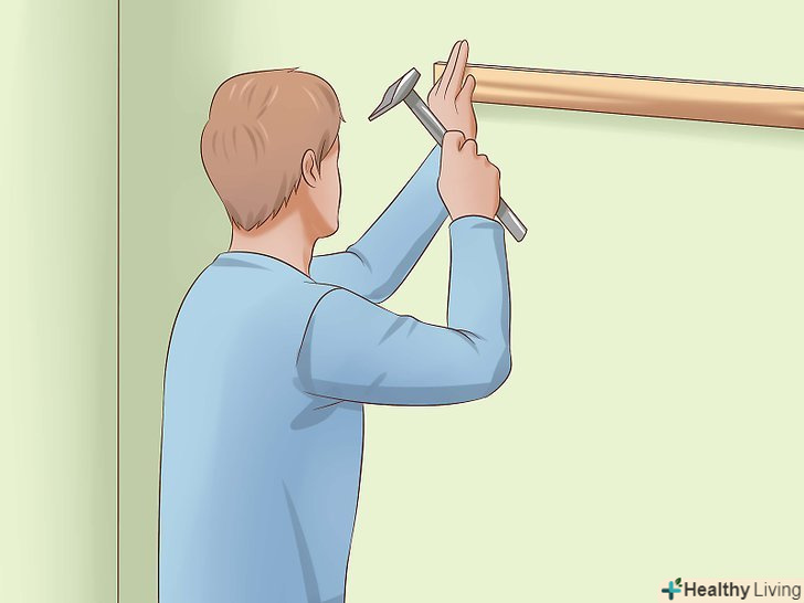 Прикріпіть рейки до стіни. за допомогою рівня перевірте, чи рівно ви прикладаєте рейку, притисніть її до того місця, де буде верх килима, і вбийте цвяхи, якщо у вас гіпсокартонна стіна, або просвердлите отвір, якщо стіна бетонна. Виконайте це з усіма рейками, ретельно заміряючи всі відстані.- Якщо ви вішаєте важкий килим, краще вибрати несучу стіну. Знайти несучу стіну можна за схемою в паспорті квартири.