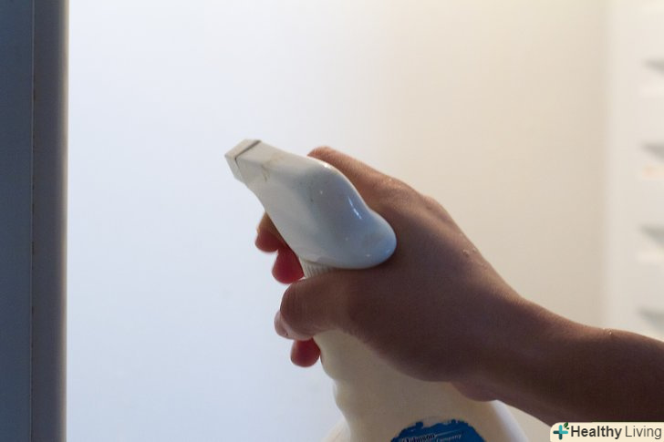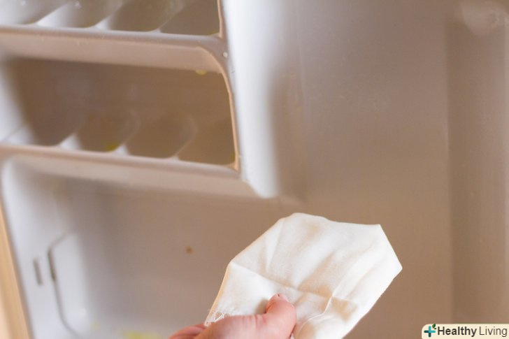 Промийте всередині холодильника обраним миючим засобом. витріть всі великі і важко-виводяться плями та інші поверхні чистою ганчіркою або губкою.- Краще не використовувати мило або хімічний миючий засіб всередині холодильника, так як їжа може ввібрати запах хімії. Замість цього використовуйте один з наступних засобів для чищення: