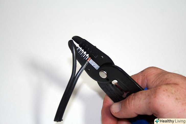 Видаліть ізоляцію з 2 нових, створених кінців проводів. видаліть близько 1 дюйма (2-3 см) ізоляції з кожного кінця дроту.- Виберіть відповідне розтин для зачистки проводу на стандартному інструменті для зачистки проводу. Стандартний інструмент для зачистки дроту матиме отвори для зачистки. Відповідний Розмір проводу для демонтажу буде позначений на інструменті.