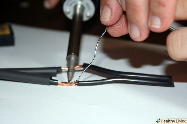 Запаяйте дроти. акуратно натисніть підготовленим кінчиком паяльника в центрі скручених проводів. Провід нагріються досить, щоб розплавити припій.- Прикріпіть припой до проводів повільно. Застосуйте достатньо припою, щоб рівномірно покрити оголені поверхні. Не треба так багато припою на проводах, щоб він не ставав купою або м'ячем і заважаючи вам бачити дроти.