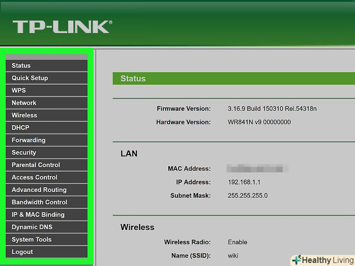 Перегляньте налаштування маршрутизатора. інтерфейс налаштувань маршрутизатора залежить від його моделі, але в більшості випадків ви знайдете наступні опції:- Settings (Налаштування): тут можна переглянути налаштування маршрутизатора, починаючи з пароля і якості з'єднання і закінчуючи типом безпеки, який використовується з'єднанням.