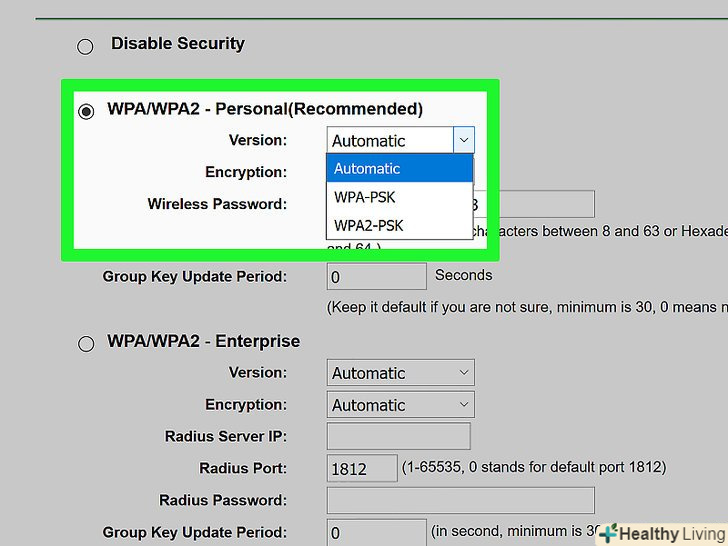 Забезпечте бездротову мережу.більшість сучасних маршрутизаторів підтримує кілька видів шифрування бездротової мережі. Використовуйте метод шифрування "WPA2", щоб забезпечити безпеку мережевого ключа.- Якщо ви змінюєте пароль, включіть в нього букви, цифри і символи, але не особисту інформацію (наприклад, дату народження).