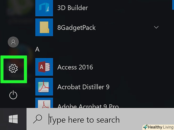 Натисніть «Параметри».ви знайдете цю опцію в нижній лівій частині меню "Пуск".