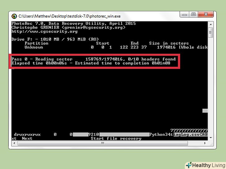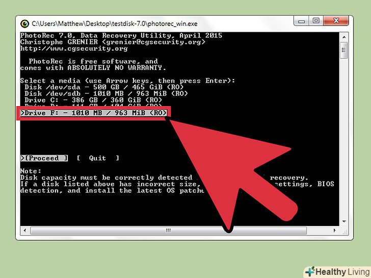 Двічі клацніть по файлу Photorec, щоб запустити програму.програма запуститься в новому вікні терміналу / командного рядка.- Якщо відкриється вікно з проханням дозволити запуск програми, зробіть це.[4]