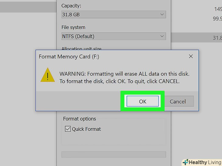 НатиснітьЗапуск, а потім натисніть OK. Windows приступить до форматування SD-карти.- Під час цього процесу файли, які зберігаються на SD-карті, будуть видалені.