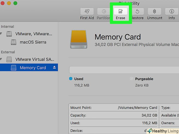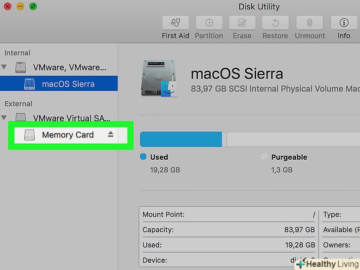 Натисніть на ім'я своєї SD-карти.воно відобразиться на лівій стороні вікна "Дискова утиліта".