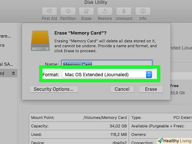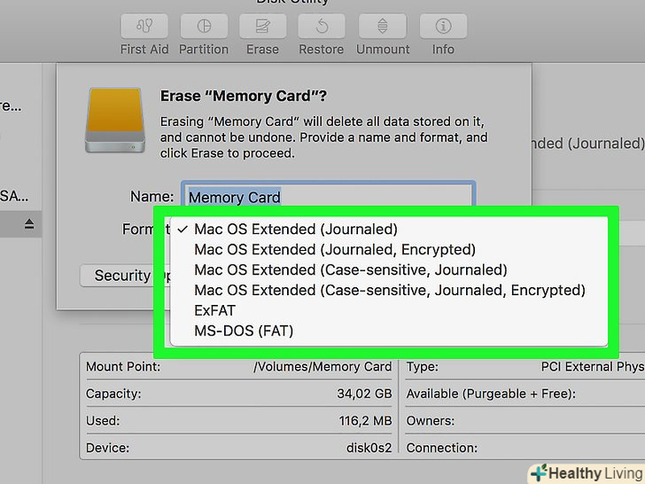Клацніть по полю в розділі "форматування". Воно знаходиться посередині екрану. Відкриється випадаюче меню з наступними опціями:- Mac OS Extended (журнальний) - стандартний формат Mac OS X. підтримує тільки Mac OS X.