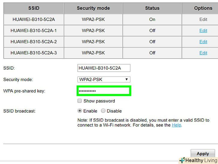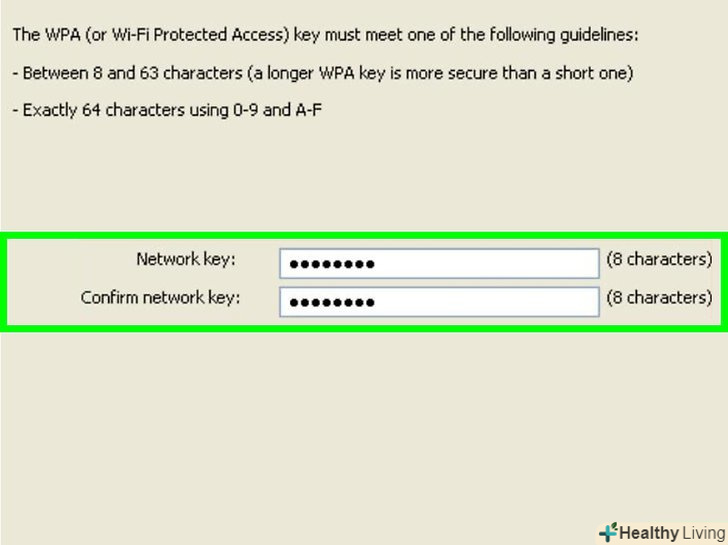 Активуйте бездротове з'єднання і встановіть тип шифрування (WEP or WPA) і введіть запам'ятовується ключ доступу.