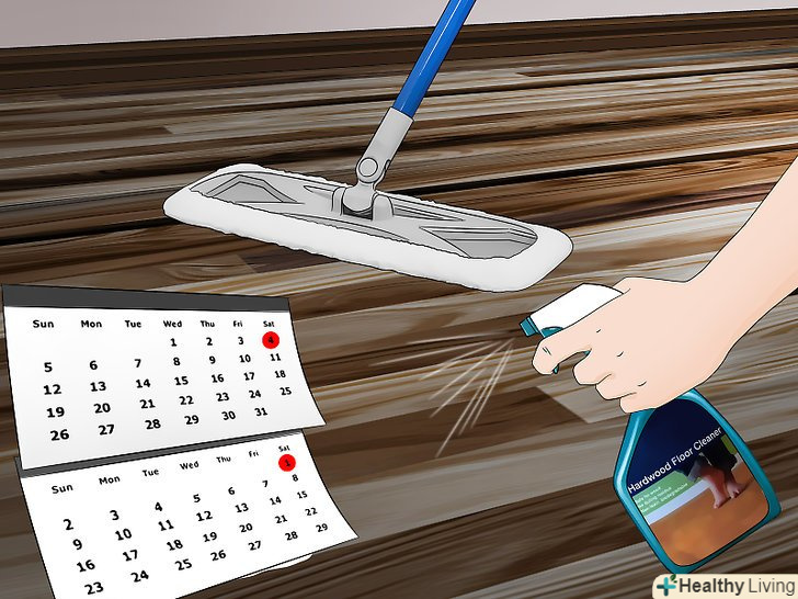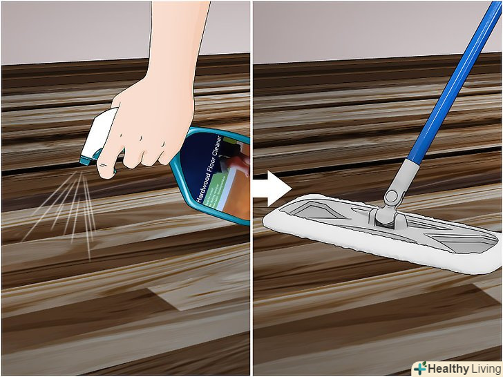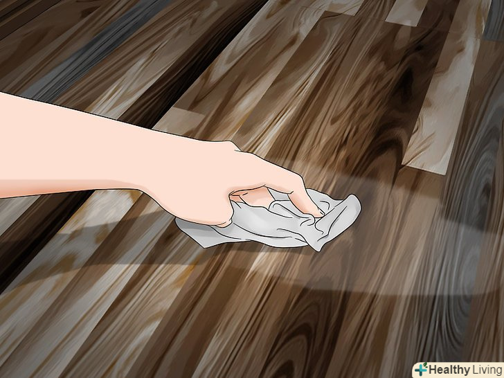 Раз на місяць протирайте підлогу шваброю з махрової тканини і засобом для миття дерев'яних підлог. переконайтеся, що використовуваний засіб підходить для дерев'яних підлог. Не використовуйте оцет, аміак та інші жорсткі хімікати. Нанесіть трохи засобу прямо на підлогу, а потім протріть його шваброю з махрової тканини. [3]- Не забудьте промити його уайт-спіритом, якщо фінішна обробка підлоги має дефекти. Не використовуйте чистячі засоби для дерев'яних підлог на водній основі, якщо в обробці є тріщини та інші дефекти.
