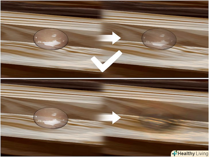 Визначте тип обробки підлоги. якщо ви купили старий будинок, розпитайте ріелтора або колишнього домовласника про дерев'яному полі. Якщо вам не вдалося нічого дізнатися, спробуйте самі перевірити обробку. [5]- Перевірте придатність обробки, розбризкавши кілька крапель води на зношену ділянку підлоги. Якщо через кілька хвилин вода так і залишиться на поверхні підлоги у вигляді крапель, значить, обробка в порядку. Якщо ж вона вбереться в дерево, значить, обробка має дефекти, а тому вам не варто використовувати чистячі засоби на водній основі.