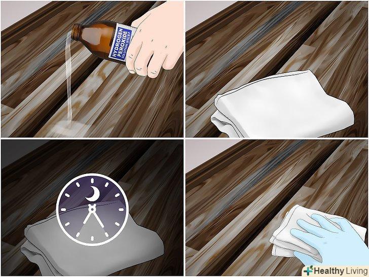 Великі і глибокі плями, залишені тваринами, замочіть перекисом водню і залиште на ніч. якщо в кімнаті з дерев'яною підлогою раніше стояв котячий туалет, то на те, щоб прибрати всі плями і запахи, вам доведеться витратити чимало часу і сил. На наступний день витріть залишки рідини, після чого відшліфуйте і заново відполіруйте підлогу. [12]- Якщо проблема полягає лише в одному невеликому плямі, накрийте його ганчіркою, змоченою в перекису (не забувайте перевіряти пляму кожні 10 хвилин). Витріть залишки перекису, коли пляма зникне.