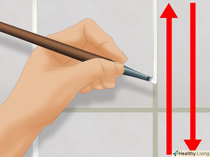 Нанесіть фарбу на шов прямим рухом. [7] занурте кінчик кисті в лоток, щоб набрати трохи фарби. Акуратно проведіть пензлем уздовж шва. Будьте обережні, щоб фарба не потрапила на навколишню плитку. Ви зможете потім видалити фарбу, проте чим менше вам доведеться чистити плитку, тим краще.- Фарба для швів пристає тільки до них і легко видаляється з плитки. Якщо ви все ж боїтеся забруднити плитку, прикрийте її малярською стрічкою. [8]