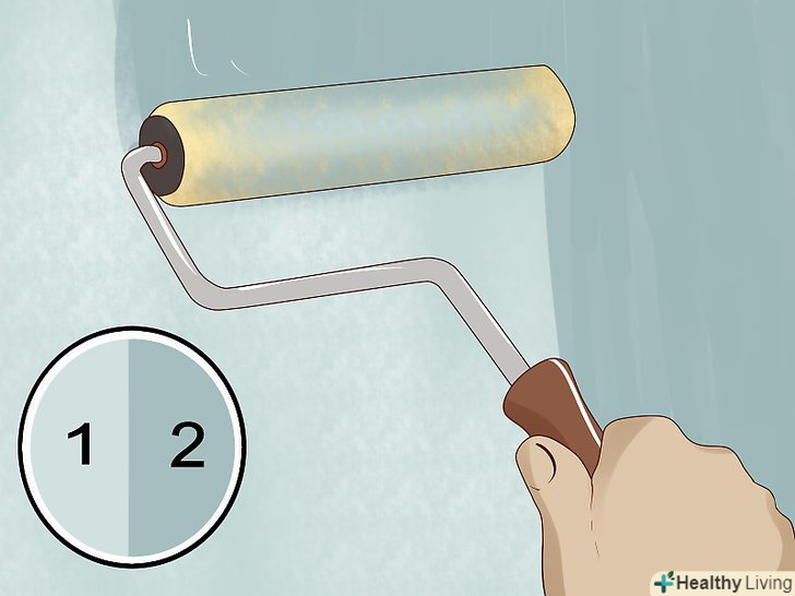 Нанесіть на стіну другий шар фарби. коли перший шар фарби висохне, рівними, розміреними мазками нанесіть на стіну другий шар фарби. Після нанесення другого шару фарби ви вже відразу зрозумієте, чи потрібно вам ще один шар. Цілком можливо, що вам знадобиться і третій шар фарби, для того щоб повністю приховати шпаклівку. [15]- Якщо ви збираєтеся наносити третій шар, дайте другому шару фарби 4-5 годин, щоб висохнути.