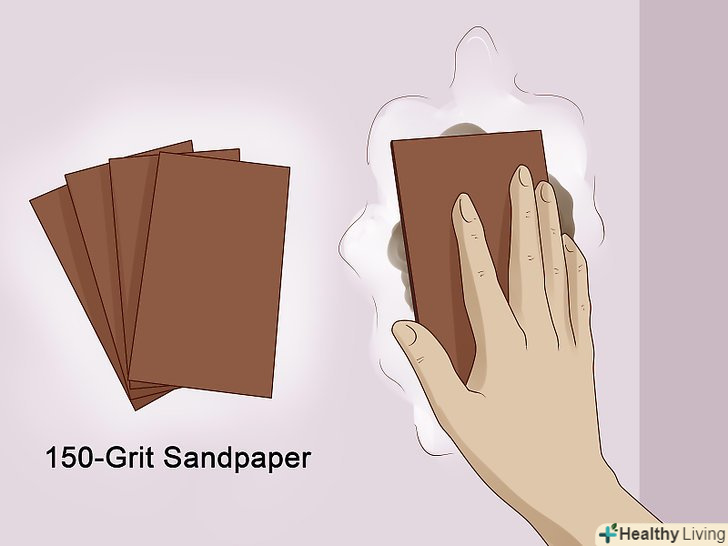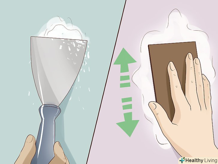Зніміть надлишки шпаклівки шпателем і наждачним папером. після нанесення всіх необхідних шарів шпаклівки зішкребіть зі стіни її надлишки за допомогою шпателя. Щоб отримати рівну поверхню, тримайте шпатель під кутом до стіни і зчищайте надлишки шпаклівки його лезом. Це полегшить подальшу роботу з ґрунтовкою і фарбою. [9]- Якщо на стіні дуже багато зайвої шпаклівки, будьте обережні зі шпателем, щоб не зчистити занадто багато матеріалу. В такому випадку краще скористатися дрібнозернистим наждачним папером і з її допомогою поступово вирівняти шар шпаклівки з площиною РЕШТИ стіни.