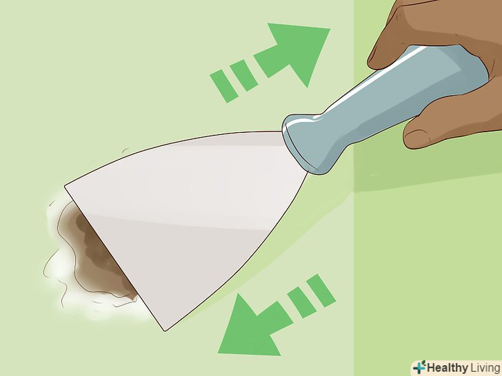 Поскребіть ремонтовану область шпателем, щоб розрівняти її. після зачистки наждачним папером обережно поскребіть гіпсокартон шпателем, щоб зняти з нього залишилися крихти матеріалів. Тримайте шпатель під нахилом до стіни і переміщайте вгору і вниз. Будьте обережні, щоб при роботі зі шпателем випадково не збільшити дірку в гіпсокартоні. [4]- Не переживайте про видалення старої фарби навколо діри. Пізніше ви зафарбуєте відремонтовану область гіпсокартону.