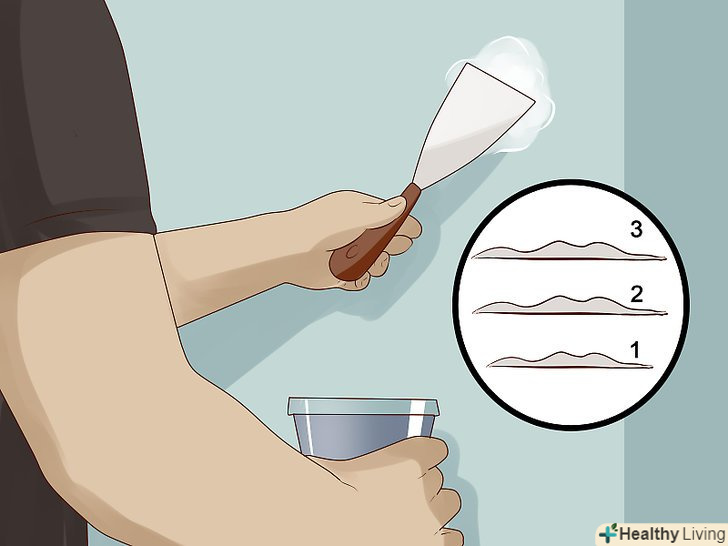 Підчепіть трохи шпаклівки шпателем і намажте її поверх дірки. використовувана кількість шпаклівки буде залежати від розмірів отвору в гіпсокартоні. Її повинно вистачити на те, щоб замазати саму дірку і захопити зачищену область навколо неї. [5]- Коли ви наносите шпаклівку, працюйте рівними радіальними рухами по відношенню до отвору на стіні.