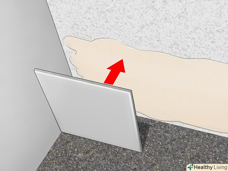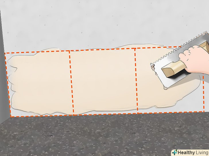 Нанесіть на стіну шар плиткового клею товщиною близько 3 мм. почніть наносити клей в нижньому кутку стіни, відступивши знизу і збоку приблизно на одну плитку, залишивши місце для крайніх плиток. Підчепити шпателем трохи приготованого плиткового клею і розподіліть його тонким шаром по стіні на площу, достатню для укладання двох-трьох плиток. [11]- Можливо, вам буде потрібно провести шпателем по плитковому клею кілька разів, щоб він ліг на стіну тонким і однорідним шаром.