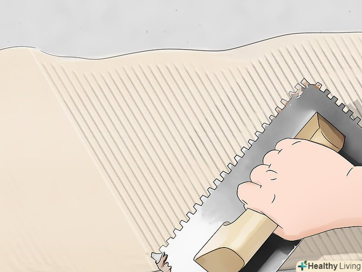 Скористайтеся зубчастим шпателем, щоб створити канавки в плитковому клеї. Візьміть і тримайте зубчастий шпатель під кутом в 45 градусів до стіни. Надаючи рівномірний тиск на шпатель, проведіть їм горизонтально по стіні, щоб створити канавки в плитковому клеї. Вони необхідні для якісного подальшого наклеювання плитки на стіну. [12]- Обов'язково звіртеся з інформацією в інструкції до плиткового клею — переконайтеся, що ви використовуєте зубчастий шпатель відповідного розміру для тієї плитки, яку збираєтеся класти, щоб вона добре клеїлася. У деяких випадках можна придбати кельму з зубцями різного розміру по двох його сторонах.