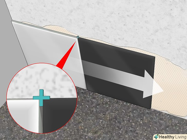 Наклейте перші плитки і далі продовжуйте укладати ряд, додаючи на стіну клей і наступні плитки ряду. обережно вирівняйте найпершу плитку і притисніть її до шару клею, трохи похитуючи, щоб забезпечити прилипання, перш ніж відпустити і залишити на місці. Потім продовжуйте укладати плитку рядами (по горизонталі або вертикалі) відповідно до обраного дизайну. Використавши всю площу стіни з уже нанесеним плитковим клеєм, наносите більше клею і продовжуйте клеїти плитку далі. [13]- Пам'ятайте, що працювати слід невеликими ділянками, наносячи плитковий клей тільки туди, куди в самий найближчий час ви наклеїте чергову плитку.