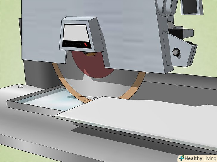 Робіть обрізку плитки за розміром за допомогою різака або спеціальних щипців. зберіть разом всі плитки, на яких ви проставили мітки для обрізки восковим олівцем в процесі пробної сухої викладки рядів. Ще раз перевірте мітки, щоб переконатися, що вони відповідають необхідному розміру. Одягніть захисні окуляри і обережно вирівняйте плитку по лінії різання під лезом або ріжучим краєм щипців. Потім проведіть різаком по плитці або ж стисніть щипці, щоб розрізати плитку. [15]- Для різання великої плитки може знадобитися оренда спеціальної циркулярної пилки по плитці.