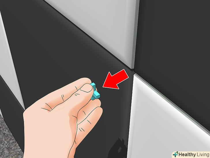 Видаліть пластикові роздільники перед затиранням швів. поки плитковий клей ще не застиг до кінця, вийміть роздільники, раніше вставлені між плитками. Це можна зробити приблизно через 1,5 години після укладання плитки і установки роздільників. Обов'язково приберіть всі роздільники, перш ніж переходити до наступного етапу робіт. [17]- Якщо залишити роздільники в клеї занадто надовго, видалити їх буде куди проблематичніше.