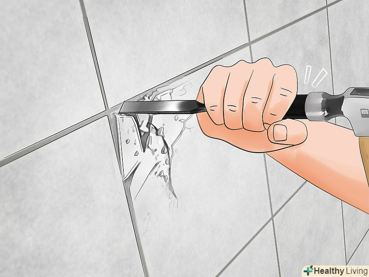 Скористайтеся зубилом і молотком, якщо вам необхідно зняти зі стіни стару плитку. надіньте захисні окуляри, перш ніж приступати до видалення плитки. Потім приставте кінчик зубила під кутом в 45 градусів до простору між двома плитками і вдарте молотком по рукоятці, щоб зняти плитку зі стіни. Далі продовжуйте забивати зубило в простір між стіною і плитками, як би соскребая їх. Працюйте, поки не видалите всю плитку і старий плитковий клей. [2]- Буває легше почати видалення плитки з кута стіни або зверху, коли є можливість приставити зубило до шву збоку, так як розчин або клей зазвичай буває слабкіше самої плитки.