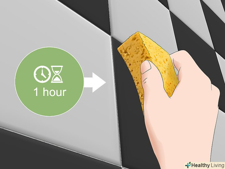 Використовуйте мокру губку, щоб протерти плитку від слідів затирання через 30 хвилин після її нанесення. закінчивши затирати шви на першій ділянці стіни, налаштуйте таймер, коли завершите роботу з другою ділянкою, встановіть ще один таймер і так далі... як тільки перший таймер спрацює, змочіть губку водою, відіжміть і протріть нею першу ділянку стіни, щоб видалити сліди затирання з поверхні плитки. [19]- Коли протрете першу ділянку, дочекайтеся сигналу другого таймера і протріть наступну ділянку стіни. Намагайтеся одночасно працювати не більше ніж з 2-3 ділянками стіни, щоб не заплутатися.