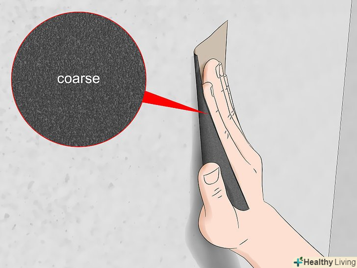 Зачистіть стіни грубої наждачним папером, щоб надати їй шорсткість і згладити виступаючі нерівності. якщо ви зняли зі стіни стару плитку, ймовірно, на ній могли залишитися після цього будь-які нерівності. Звичайно, плитку можна покласти і поверх них, але згладжування нерівностей дозволить уникнути нерівної укладання плитки. Вам знадобиться наждачний папір з зерном 12-H (P100) або 20-H (P80). Одягніть респіратор, щоб захистити легені від пилу під час роботи. [4]- Якщо вам необхідно зачистити велику площу, можливо, буде простіше скористатися шліфувальною машиною.