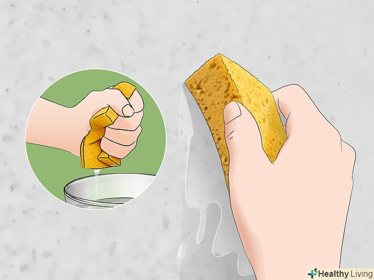 Протріть стіну вологою губкою, щоб прибрати з неї пил. занурте губку у відро з чистою водою і відіжміть. Потім, починаючи з самого верху, проведіть губкою по стіні, збираючи з неї пил. Сполосніть губку і продовжуйте працювати, поки не протрете всю стіну. Зачекайте мінімум годину до повного висихання стіни. [5]- Якщо ви працюєте з дуже великою площею, можливо, вам буде потрібно оновлювати воду в відрі через кожні кілька проходів з губкою, щоб вода залишалася чистою і губка дійсно збирала пил.