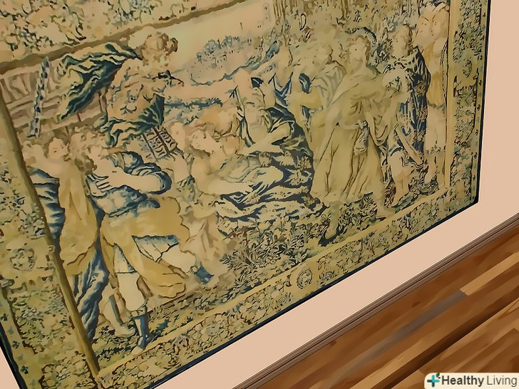 Повісьте на стіни гобелени або картини. вони не тільки будуть поглинати звук, але і оживлять кімнату. Пройдіться по магазинах у пошуках цікавих предметів мистецтва. Великі картини і товсті гобелени будуть поглинати чималу кількість звукових хвиль. Щоб повісити картину, виберіть для неї відповідне місце, забийте в стіну міцний цвях, а потім підвісьте картину за шнур. [3]- Існує кілька різних способів повісити гобелен . Як правило, для цього необхідно взяти стрижень, схожий на той, на який ви повісили фіранки.