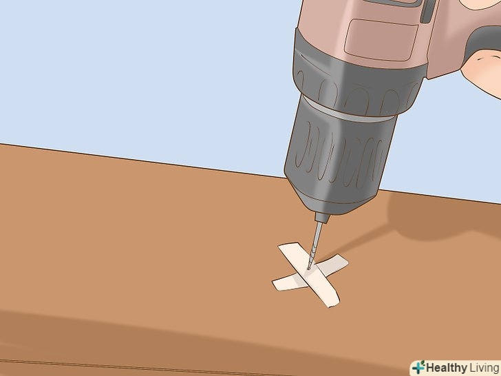 Просвердлите наметочное отвір. у багатьох випадках ви досягнете кращих результатів, якщо спочатку створите наметочное отвір меншого діаметру, ніж вам необхідно. Просто просвердлите меншим свердлом неглибоке наметочное отвір, а потім перейдіть на більш велике свердло потрібного розміру, щоб завершити роботу. Наметочное отвір не дозволить свердлу зміститися з потрібної точки, а також охоронить деревину від розтріскування та інших пошкоджень при свердлінні. [12]- Дуже крихкі матеріали, такі як кераміка і скло , вимагають особливої обережності. Наклейте невеликий хрест у вигляді " X " з малярного скотча там, де збираєтеся просвердлити отвір, щоб запобігти зісковзування Свердла і утворення відколів. Замість створення наметочного отвори приставте дриль свердлом до скотчу і обережно стукніть по ній молотком з іншого кінця, щоб накерніть маленьке поглиблення (або скористайтеся для цього кернером).