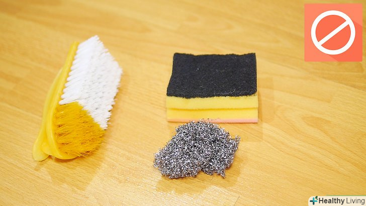 Уникайте абразивних чистячих серветок. ламінована підлога дуже легко подряпати, тому не використовуйте чистячі серветки або інші абразивні матеріали. Для протирання підлоги найкраще використовувати м'яку безворсову ганчірку або тканину з мікрофібри. [13]- До абразивних матеріалів відносяться сталеві мочалки, абразивні серветки і абразивні губки.