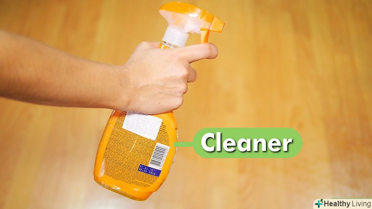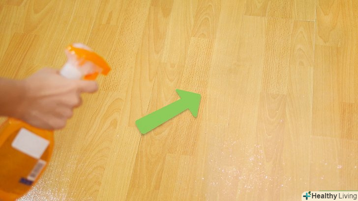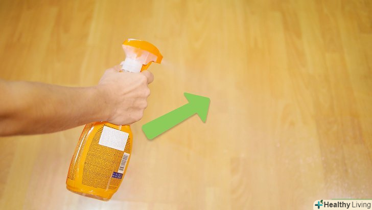 Розпиліть миючий засіб прямо на підлогу. нанесіть тонкий рівний шар миючого засобу. Почніть з невеликої ділянки, який можна протерти шваброю, не наступаючи при цьому на мокру підлогу. [4] Так як не можна, щоб ламінат довго мок, не обприскуйте підлогу великою кількістю рідини.- Ніколи не мийте ламінат мокрою шваброю або ганчіркою, так як зайва волога не піде йому на користь.