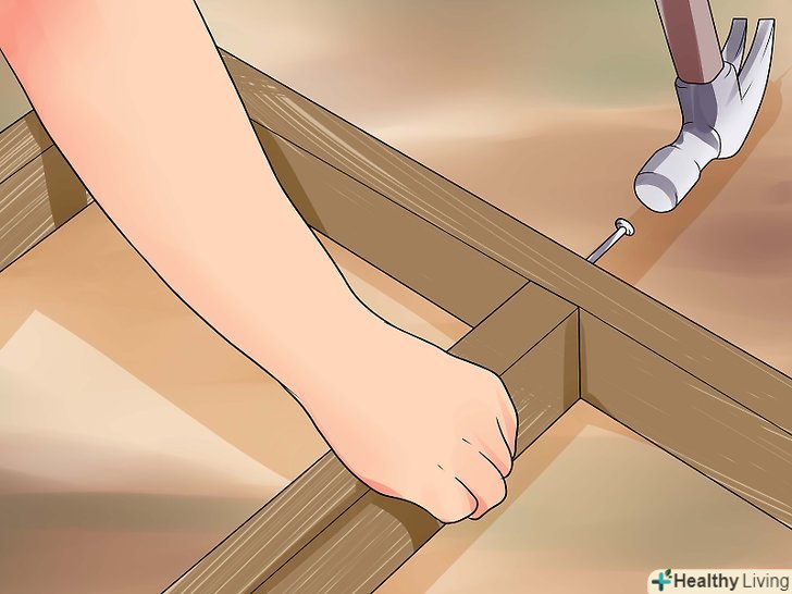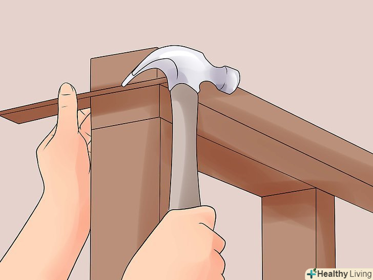 Зберіть раму. Використовуйте свої стійки, щоб викласти раму потрібного розміру і форми. Монтаж дощок буде відбуватися на підлозі.- Почніть з самого краю. Покладіть стійку встик з верхнім краєм нижньої направляючої, і за допомогою шурупа 7.6 см прикрутіть її до стійки з тильного боку. Переконайтеся, що дошки лежать прямо.