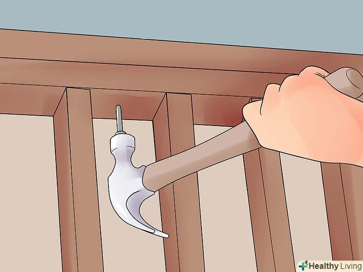 Встановіть Розпірки. Розпірки є короткими відрізками все тієї ж дошки 5 х 10 см, які встановлюються перпендикулярно між стійками на відстані близько 90 см від нижньої частини стіни. Виміряйте відстань між стійками, і виріжте додаткові дошки відповідно. Встановіть Розпірки за допомогою шурупів 7.6 см, вкручуючи їх під кутом 60 градусів з обох країв для забезпечення їх міцного положення між стійками.- Розташуйте Розпірки в шаховому порядку по висоті. Вибудуйте в лінію верхню кромку другої Розпірки з нижньою кромкою першої, а потім зробіть навпаки з наступною розпіркою, зберігаючи порядок. Це повинно забезпечити достатньо місця, для того щоб прибити їх до кожної стійки.